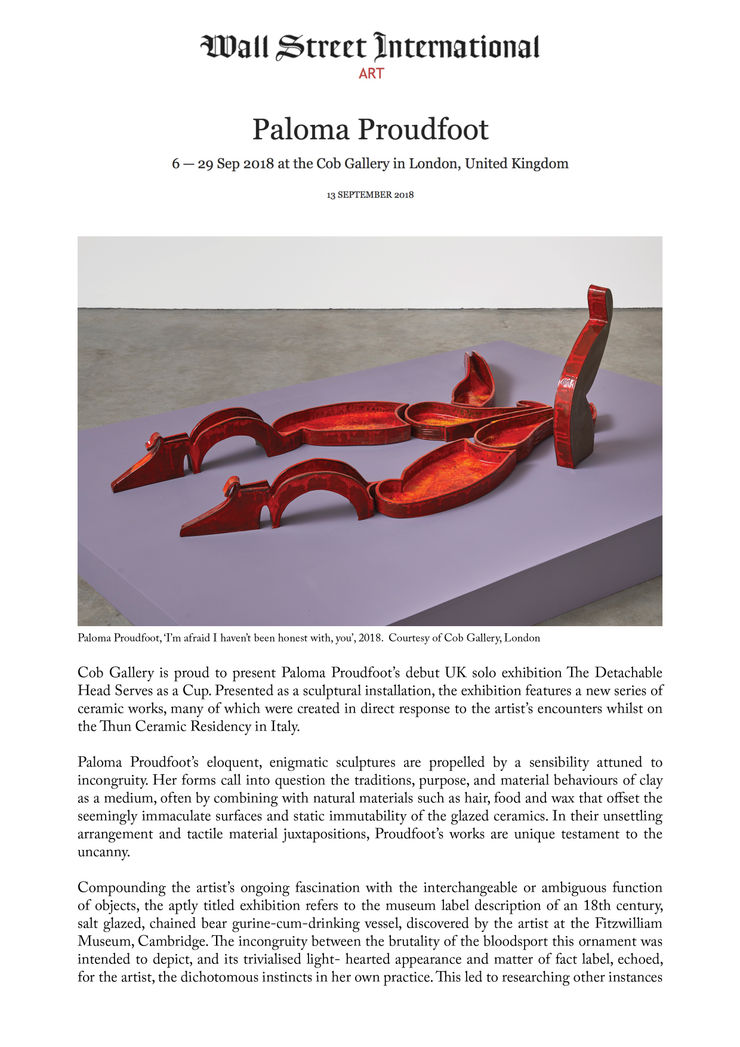 Cob Gallery is proud to present Paloma Proudfoot’s debut UK solo exhibition The Detachable Head Serves as a Cup. Presented as a sculptural installation, the exhibition features a new series of ceramic works, many of which were created in direct response to the artist’s encounters whilst on the Thun Ceramic Residency in Italy.